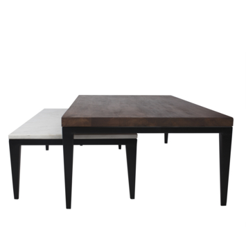 Deze in het oog springende koffietafel is een aanwinst voor elk interieur. De tafels zijn gemaakt met een zwart metalen onderstel, waarvan de hoge tafel is voorzien van een donker houten blad en de lage tafel is voorzien van een marmeren top. Doordat de 2 tafels verschillend van hoogte zijn, kun je de tafels in elk gewenste combinatie neerzetten. Afmeting (bxdxh) van de houten tafel is 98x50x28 cm en van de marmeren tafel is 80x40x21 cm.