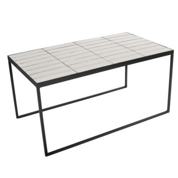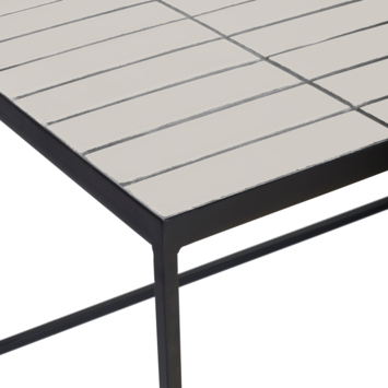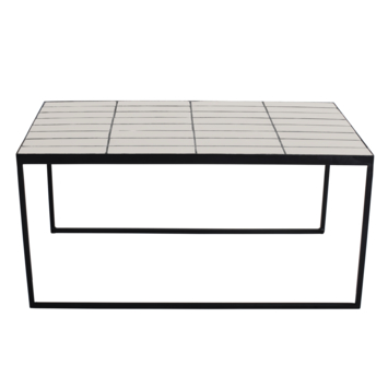 Deze stijlvolle koffietafel heeft een metalen frame en een blad met keramieke handgemaakte tegels. Het blad heeft een metalen rand en de voegen zijn lichtgrijs. Het tafeltje is ook te gebruiken als tafel in de woonkamer of als tafeltje in de gang. Er is van de Nomad ook een bijzettafel verkrijgbaar goed om te combineren! De afmeting is (dxbxh): 42x80x32 cm