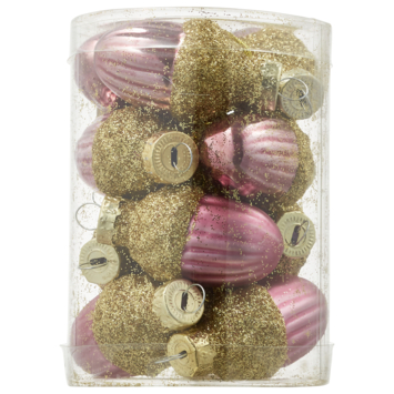 Koker met 12 eikeltjes gemaakt van glas om in de kerstboom te hangen. De eikeltjes zijn ook verkrijgbaar in de kleur zilver.