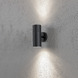 De Konstsmide buitenlamp Modena XL antraciet 2-lichts is een moderne buitenlamp die zowel naar boven als naar beneden schijnt. Je creëert sfeer en gezelligheid in je tuin doordat de buitenlamp een prachtig effect op de muur laat zien. Het armatuur is geschikt voor twee lampen met GU10 fittingen van maximaal 35 watt.