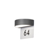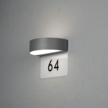 Deze fraaie Konstsmide buitenlamp Monza antraciet met huisnummer is een compact en modern vormgegeven power LED armatuur met frost acrylglazen en een naar wens -dus wel of niet te gebruiken- te gebruiken acrylplaat waarop maximaal 3 zelfklevende meegeleverde huisnummers kunnen worden geplakt. De kleur van de zelfklevende cijfers is zwart en er worden 3 sets van 0-9 meegeleverd in de verpakking.