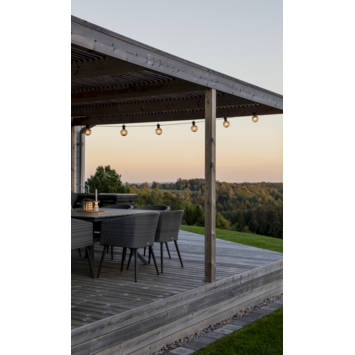Maak een extra gezellig en sfeervol feestje van al je activiteiten in je binnen- of buitenruimte met dit prachtige, decoratieve en zeer energiezuinige PowerLED feestverlichtingsnoer met vervangbare lichtbron. Dit dimbare LED lichtsnoer (100-75-50-25% output) van het Zweedse premium merk Konstsmide met 10 acryl smoke transparante globes heeft een verlichte snoerlengte van 4.5 meter (eerste lamp tot laatste lamp). De verlichte smoke globes met E27 schroeffitting hebben een fantastisch mooie warme lichtkleur van ca 2200 K en een hoge, gelijkmatige lichtoutput gedurende de hele levensduur. De afstand tussen de LED lampen is 50 cm. De lichtbron is midden in de bol geplaatst voor maximale lichtspreiding. De lampjes zijn van UV-bestendig kunststof en blijven dus doorzichtig smoke transparant tijdens de gehele levensduur van het snoer en zijn bovendien niet breekbaar. De kabelkleur is zwart. Het aansluitsnoer tot aan de eerste lichtbron is 10 meter lang, dus het snoer is vrijwel altijd zonder een verlengsnoer op een stopcontact aan te sluiten. De LED lichtbronnen gaan ten minste 20.000 uur mee, dat wil zeggen minimaal 20 jaar bij dagelijks gebruik van 3 uur. Het snoer is een veilig 24 V laagspanning snoer en is zeer energiezuinig met een verbruik van slechts 7,2 W. De transformator is van een uitstekende kwaliteit en indien nodig vervangbaar. De ruime kabeldiameter garandeert een hoge trekbelasting. Het lichtsnoer heeft een Europees veiligheidskeurmerk EN50698 en is uitstekend beschermd en geïsoleerd tegen vocht van buitenaf (fittingen stevig handvast aandraaien!). Het EMC keurmerk EN55015 garandeert dat dit lichtsnoer geen storing veroorzaakt op frequenties van andere elektrische apparaten, mobiele telefoons of draadloze netwerken als WiFi of Bluetooth. Bij de productie worden kwalitatief hoogwaardige onderdelen en recyclebare of circulaire materialen gebruikt met een minimale milieubelasting. Het snoer kan binnen en buiten worden gebruikt (IP44 rating tegen vocht en stof). Het is alleen niet geschikt voor gebruik in of onder water. Je kunt het lichtsnoer gebruiken als sfeerverlichting aan of rond je woon- of recreatieverblijf. Denk aan speciale feestelijke gelegenheden als barbecue, tuinfeest, familiereünie, examenfeest, verjaardag, housewarming, of buurtfeest. Maar ook als permanente verlichting in je tuin, terras, serre of partytent. Gemakkelijk aan te brengen met tie ribs aan bijvoorbeeld een balkon, pergola, erfafscheiding, parasol, voortent, luifel. Kies voor kwaliteit, optimale sfeer en vochtdichte partyverlichting met dit kwaliteitssnoer van Konstsmide.