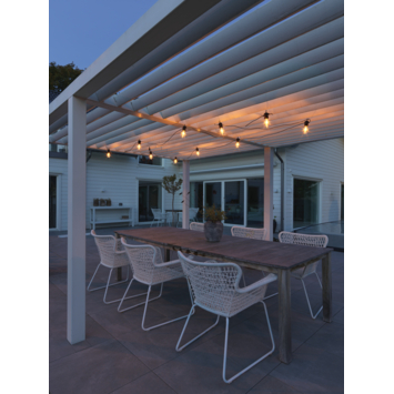 Dit Konstsmide feestverlichting lichtsnoer is een startersset die zowel energiebesparing als sfeer biedt. Dankzij de LED-technologie verbruikt de verlichting minder energie in vergelijking met traditionele lampen, zonder in te boeten aan helderheid. De 10 amberkleurige diodes geven een aangenaam, warm licht dat direct een gezellige ambiance creëert. De zwarte kabel past in elk tuindecor, waardoor het een stijlvolle toevoeging is aan je buitenruimte. Deze tuinverlichting is ontworpen voor buitengebruik en heeft een IP44-classificatie, wat betekent dat het bestand is tegen waterspatten en dus veilig kan worden gebruikt in verschillende weersomstandigheden. Dit maakt de set perfect voor het verlichten van je terras, veranda of tuinhuis. De dimmer geeft je de mogelijkheid om de lichtsterkte eenvoudig aan te passen, zodat je altijd de juiste sfeer kunt creëren, of je nu een feest geeft of een rustige avond doorbrengt. De Konstsmide LED biertuinkettingen systeem basisset is zeer gebruiksvriendelijk. Met een 10,85 meter lange voedingskabel heb je voldoende lengte om de verlichting gemakkelijk te installeren, onafhankelijk van de stroombron. Het systeem is transformator-aangedreven, wat zorgt voor een stabiele stroomvoorziening en eenvoudige installatie. Het geheel is robuust gebouwd, waardoor je lang kunt genieten van een sfeervol verlichte buitenruimte.