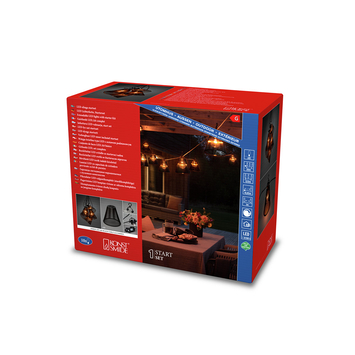 Maak het hele jaar door een geslaagd feestje van alle (buiten) activiteiten met dit stijlvolle en sfeervolle koppelbare feestverlichting snoer met 4 traps dimmer van het Zweedse premium merk Konstsmide. Dit 10 lamps en 10m lange filament LED lichtsnoer heeft UV bestendige acryl peertjes met zwarte decoratie rasters en een prachtige extra warmwitte sfeervolle lichtkleur. Dit startsnoer van 10m lengte kan worden verlengd met nog eens maximaal 3x add-on snoeren van 10m lengte van het type 2334-870 tot maximaal 40m verlichte snoerlengte. De sfeervolle filament LED-lichtbronnen zijn energiezuinig maar toch krachtig. De lichtbronnen zijn niet verwisselbaar maar dat is gezien de lange levensduur niet nodig. Het snoer is bestand tegen extreme Scandinavische weersomstandigheden en doorstaat moeiteloos hoge en lage temperaturen. De acryl peertjes zijn zeer goed geïsoleerd tegen binnendringend water. De lengte van het aansluitsnoer bedraagt maar liefst 10 meter en het snoer is bovendien voorzien van speciale ophanghaakjes. Daardoor is het snoer makkelijk op te hangen. Het snoer werkt op een IP44 goedgekeurde 24V buitentrafo en is voorzien van een Europees veiligheidskeurmerk en daarmee volkomen veilig in gebruik. De LED-lichtbronnen gaan ten minste 20.000 uur mee, dat wil zeggen minimaal 20 jaar bij dagelijks gebruik van 3 uur. De LED-lichtbronnen zijn zeer kleurhomogeen hebben minimaal verlies aan output gedurende de levensduur. Op de trafo van dit lichtsnoer is een ingebouwde dimmer verwerkt waarmee de output van het snoer op 100% - 75% -50% -25% kan worden ingeschakeld. De dimmer heeft een memoryfunctie dus na onderbreking van de stroomtoevoer hervat de dimmer met de laatst ingestelde dimmerstand. De dimmer is tevens de aan/uit schakelaar. Het lichtsnoer is kwalitatief hoogwaardig. Konstsmide lichtsnoeren worden vervaardigd in een BSCI/SA8000 (Business Social Compliance Initiative) gecertificeerde productielocatie. Het snoer kan zowel binnen en buiten worden gebruikt en zorgt voor een gezellig, feestelijk tintje bij speciale gelegenheden als een barbecue, tuinfeest, WK/EK, examenfeest, verjaardag, jubileum, housewarming, huwelijksfeest, babyshower, kraamfeest en kan worden opgehangen in de tuin, terras, serre, partytent of aan balkon, pergola, parasol, voortent, luifel, erfafscheiding. In de winterperiode is dit snoer bij uitstek geschikt voor verlichting van bomen en struiken. Het aansluitsnoer is met 10 meter zeer ruim. De afstand tussen de lampen is 100cm. Met dit lichtsnoer van Konstsmide kies je voor premium kwaliteit en optimale sfeer!