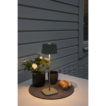 Deze USB oplaadbare, draadloze terras/serre/lounge vierkante LED tafellamp Capri 7814 op batterij is een mintgroene aluminium tafellamp van het Zweedse premium merk Konstsmide®. Deze veelzijdige tafellamp met een afmeting van 10x36cm die op batterij werkt, is eenvoudig op te laden. De lamp kun je plaatsen op een docking station en kan na het opladen 9u nonstop en draadloos op maximaal vermogen (of 18u op 50% vermogen) binnen of buiten worden gebruikt. Deze moderne en energiezuinige lamp heeft 10 LED lichtbronnen en kun je volledig bedienen met de touch button die 3 functies heeft. Je kunt de tafellamp hiermee aan en uit zetten (ON/OFF), de lichtkleur kiezen (2700K extra warmwit of 3000K warmwit) en heen en terug dimmen. De kleur van de touchbutton (rood of groen) geeft groen licht wanneer de lamp in werking en/of volledig is opgeladen en rood als de batterij leeg raakt en/of wordt opgeladen. De laadtijd bedraagt maximaal 6u. De lamp kan overal binnen of buiten worden neergezet. De sfeer kun je mede bepalen door de lamp traploos terug te dimmen. De lengte van het meegeleverde USB snoer is 1.5m. Gebruik een 5V adapter met een vermogen van maximaal 1A. De lichtbronnen, de LED driver en de twee 3.7V LI-ION batterijen zijn beiden van uitstekende kwaliteit. De lichtbronnen gaan de hele levensduur van het armatuur mee.