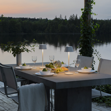 Deze USB oplaadbare, draadloze terras/serre/lounge vierkante LED tafellamp Capri 7814 op batterij is een matwitte aluminium tafellamp van het Zweedse premium merk Konstsmide®. Deze veelzijdige tafellamp met een afmeting van 10x36cm die op batterij werkt, is eenvoudig op te laden. De lamp kun je plaatsen op een laadstation en kan na het opladen binnen of buiten worden gebruikt. Deze moderne en energiezuinige lamp heeft 10 LED lichtbronnen en kun je volledig bedienen met de touch button die 3 functies heeft. Je kunt de tafellamp hiermee aan en uit zetten (ON/OFF), de lichtkleur kiezen (2700K extra warmwit of 3000K warmwit) en heen en terug dimmen. De kleur van de touchbutton (rood of groen) geeft groen licht wanneer de lamp in werking en/of volledig is opgeladen en rood als de batterij leeg raakt en/of wordt opgeladen. De laadtijd bedraagt maximaal 6u. Het armatuur is na volledige lading vervolgens binnen of buiten draadloos gedurende 9u worden gebruikt op maximaal vermogen. De lamp kan overal binnen of buiten worden neergezet. De sfeer kun je mede bepalen door de lamp traploos terug te dimmen. De lengte van het meegeleverde USB snoer is 1.5m. Gebruik een 5V adapter met een vermogen van maximaal 1A. De lichtbronnen en de LED driver zijn beiden van uitstekende kwaliteit. De lichtbronnen gaan de hele levensduur van het armatuur mee. De LED lichtbronnen zeer energiezuinig met een totaalverbruik van slechts 2.2W.