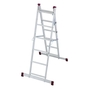 A-stand reformladder (foto 3): door de beide 6 treden ladders (de zijsteunen van de steiger) met elkaar te verbinden ontstaat een reformladder in A-stand. In deze opstelling kun je de ladder vrijstaand plaatsen wat bijvoorbeeld handig is voor het ophangen van een lamp aan het plafond of bij snoeiwerkzaamheden in de tuin. In A-stand is de hoogte van de ladder 160 cm zodat je een maximale werkhoogte kunt bereiken van 270 cm.