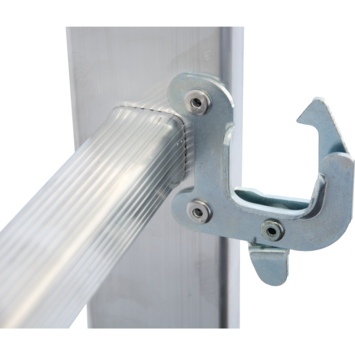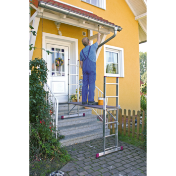 6 treden enkele ladder: je kunt de beide 6 treden ladders (de zijsteunen van de steiger) ook zelfstandig als 6 treden enkele ladder gebruiken. Door de stabiliteitsbalk aan de onderkant staat de ladder dan ook erg stabiel. De hoogte van de ladder is dan 160 cm waardoor je een maximale werkhoogte kunt bereiken van ongeveer 260 cm.