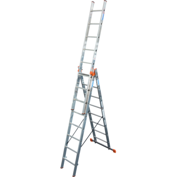 De Krause Tribilo Schuifladder is een multifunctionele, driedelige aluminium ladder die kan worden gebruikt als schuine, uitschuifbare en vrijstaande ladder met een uitschuifbaar ladderdeel. Deze schuifladder is voorzien van gepoedercoate stalen geleideprofielen voor meer gebruiksgemak, van zelfvergrendelende hendels (AutoSnap-systeem) voor veilig transport en van weerbestendige en scheurvaste spanbanden. Daarnaast beschikt deze schuifladder over een brede stabilisator voor nog meer stabiliteit en over antislip voetkappen en pluggen (SafetyCap).