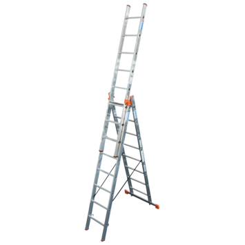 De Krause Tribilo Schuifladder is een multifunctionele, driedelige aluminium ladder die kan worden gebruikt als schuine, uitschuifbare en vrijstaande ladder met een uitschuifbaar ladderdeel. Deze schuifladder is voorzien van gepoedercoate stalen geleideprofielen voor meer gebruiksgemak, van zelfvergrendelende hendels (AutoSnap-systeem) voor veilig transport en van weerbestendige en scheurvaste spanbanden. Daarnaast beschikt deze schuifladder over een brede stabilisator voor nog meer stabiliteit en over antislip voetkappen en pluggen (SafetyCap).