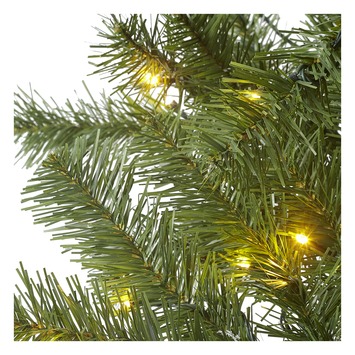 Kunstkerstboom Oslo compleet met LED-lampjes, warmwit. Geschikt voor buiten en binnen. Hoogte 180 cm met metalen voet. Breedte 106 cm. Materiaal PVC. Getest op brandveiligheid volgens de norm: NEN-EN 71-2. Kerstverlichting met KemaKeur.