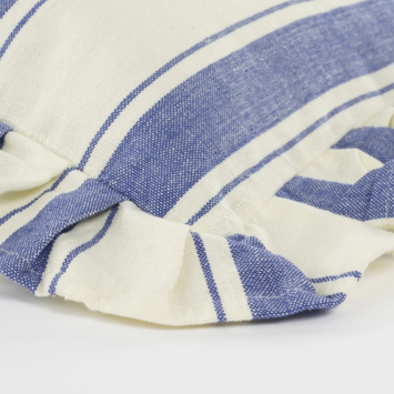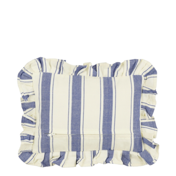 Geef je interieur een vrolijke uitstraling met dit sierkussen. Het kussen heeft een speels streeppatroon in de kleuren blauw en wit, afgewerkt met ruches langs de rand. Gemaakt van katoen, voelt het heerlijk zacht aan. Lekker comfortabel! Dit sierkussen is perfect om je bank, bed of fauteuil extra sfeer te geven. Een gezellige toevoeging aan je woonkamer, kantoor of slaapkamer! De afmetingen zijn L35 x B20 x H10 cm.