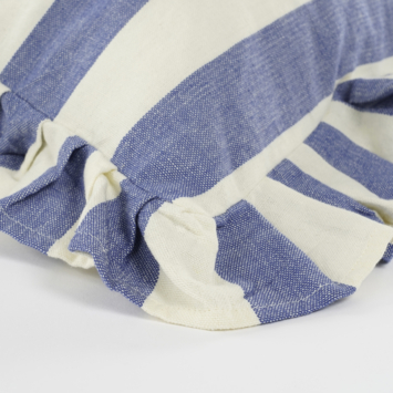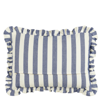Geef je interieur een vrolijke uitstraling met dit sierkussen. Het kussen heeft een speels streeppatroon in de kleuren blauw en wit, afgewerkt met ruches langs de rand. Gemaakt van katoen, voelt het heerlijk zacht aan. Lekker comfortabel! Dit sierkussen is perfect om je bank, bed of fauteuil extra sfeer te geven. Een gezellige toevoeging aan je woonkamer, kantoor of slaapkamer! De afmetingen zijn L70 x B50 x H10 cm.