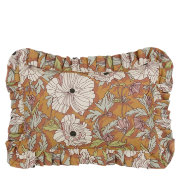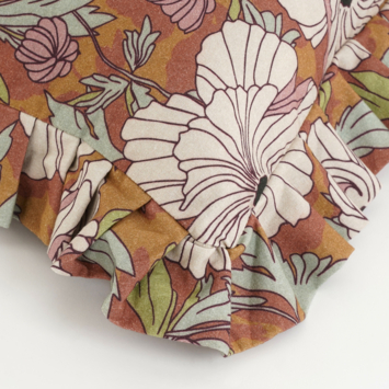 Geef je interieur een romantische en speelse uitstraling met dit bruine kussen met bloemenprint en sierlijke ruches. Het kussen is gemaakt van katoen en heeft een rijk dessin met grote bloemen en bladeren in zachte tinten, waardoor het direct sfeer brengt op je bank, fauteuil of bed. De opvallende rucherand rondom zorgt voor een trendy, decoratieve finishing touch en maakt het kussen een echte eyecatcher. Met een formaat van L67 x B47 x H10 cm is het heerlijk groot en comfortabel, perfect om tegenaan te leunen of om jouw zithoek extra gezellig te maken. Mooi te combineren met effen kussens of andere botanische prints voor een warm geheel.