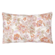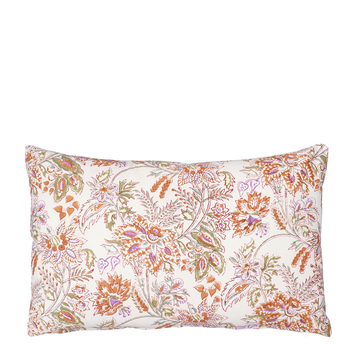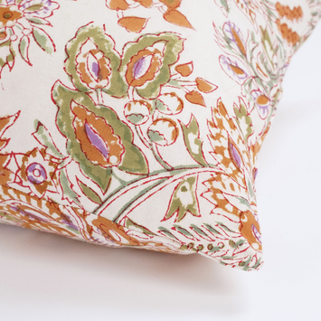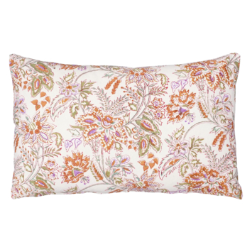 Breng de natuur dichter bij je in huis door middel van dit mooie sierkussen. Dit langwerpige model heeft een beeldig ontwerp van natuurlijke groene bladeren en oranje, witte en paarse bloemen en is gemaakt van ademend katoen|Het kussens is gemaakt met block-printing. Het is met de hand gestempeld. De basis stof is off-white van kleur en de print bestaat uit de kleuren oranje, lila en groen. Hij heeft een praktische afmeting van 55 cm lang, 35 cm breed en 10 cm hoog. Dit kussen is ook erg leuk te combineren met een van de andere gebloemde sierkussens uit onze collectie.