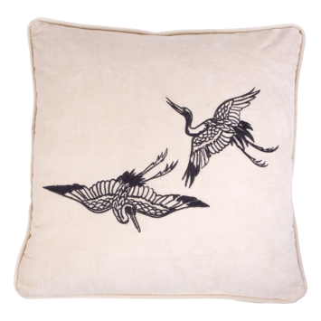 Kussen Kraanvogel is gemaakt van een prachtige fluwele stof en is vervolgens geborduurt met de afbeelding van twee kraanvogels. Dit kussen heeft een rijke uitstraling in je interieur en is te gebruiken in verschillende interieursferen.