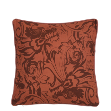 Geef je bank, fauteuil of bed een warme en opvallende uitstraling met dit bruine sierkussen. Het kussen is gemaakt van katoen en heeft een decoratieve print met sierlijke vormen in donkere tinten, waardoor het direct een statement maakt in je interieur. Dankzij het vierkante formaat is het ideaal om te combineren met andere kussens in effen kleuren of met verschillende prints voor een speels geheel. Met een afmeting van L45 x B45 x H10 cm is dit kussen een stijlvolle toevoeging voor extra sfeer en comfort in elke ruimte.