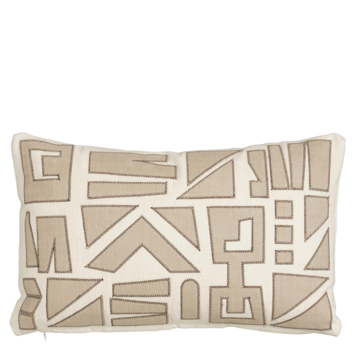 Geef je bank, fauteuil of bed een moderne uitstraling met dit beige kussen met grafisch dessin. Het kussen is gemaakt van katoen en heeft een decoratief patroon met verschillende vormen en lijnen, waardoor het een opvallend maar rustig accent vormt in je interieur. De neutrale kleur is makkelijk te combineren met andere kussens in aardetinten of met een effen plaid voor een mooi geheel. Met een formaat van L55 x B35 x H10 cm is het een fijne toevoeging voor extra sfeer en comfort in elke ruimte.