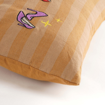 Dit sierkussen brengt een speelse knipoog in huis. De geborduurde pumps in roze, rood en paars geven het gestreepte bruine katoen een vrolijk en stijlvol accent. Een leuke eyecatcher voor de tienerkamer, een garderobehoek of als opvallend detail op de bank. De stevige katoenen stof voelt robuust aan, terwijl de zachte vulling zorgt voor comfort. Met een compact formaat van 35 bij 25 centimeter is dit kussen klein van stuk, maar groots in uitstraling.