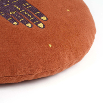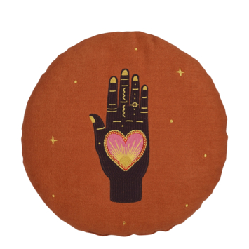 Dit ronde sierkussen in warme bruintint brengt direct een bohemian sfeer in huis. De geborduurde hand als detail geeft het ontwerp karakter, terwijl de stevige katoenen stof zorgt voor een fijne, comfortabele touch. Mooi als opvallend accent op de bank, in een fauteuil of op bed. Met een diameter van 40 centimeter en een hoogte van 10 centimeter is dit kussen een stijlvol detail dat warmte én persoonlijkheid toevoegt aan je interieur.