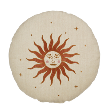 Met dit ronde beige sierkussen haal je direct een warme, bohemian sfeer in huis. Het zonvormige motief voegt een speels detail toe, terwijl de zachte kleur zich makkelijk laat combineren met natuurlijke materialen en rustige tinten. Leuk op de bank, in een fauteuil of als blikvanger op het bed. Met een diameter van 40 centimeter en een hoogte van 10 centimeter is het een subtiele sfeermaker met karakter.