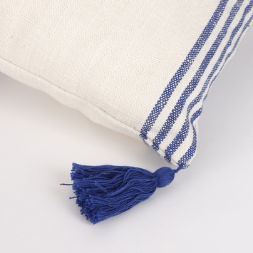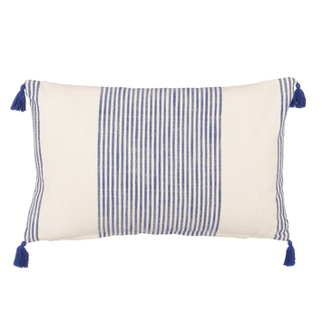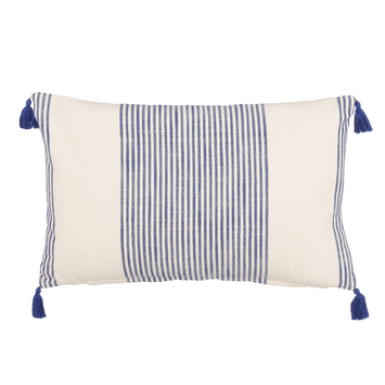 Fleur jouw stoel of bank op met dit gestreepte kussentje. Het kussentje is gemaakt van katoen en heeft een frisse, witte kleur met blauwe strepen. Hierdoor weet hij in elk interieur wel een plekje te vinden. Door de langwerpige vorm is hij daarnaast ook nog eens extra comfortabel. Hij valt perfect in je rug! De hoeken van het kussen zijn afgewerkt met speelse kwastjes en maken het geheel helemaal af. Het kussen is 55 cm lang en 35 cm breed.
