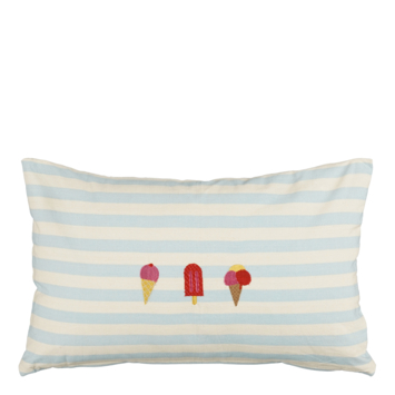 Dit sierkussen brengt het ultieme vakantiegevoel naar je interieur! De frisse, lichtblauwe-witte strepen en geborduurde ijsjes geven je bank of fauteuil een vrolijke, zomerse uitstraling. Ook leuk: geef hem een leuke plek in je vakantiewoning of strandhuisje. Het bankkussen is gemaakt van zacht katoen en komt in de afmetingen L55 x B35 x H10 cm. Heb je al een plekje bedacht?