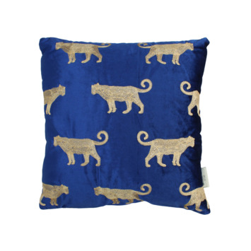 Het Kussen luipaard velvet blauw heeft een unieke uitstraling. Door het design van gouden luipaarden op een blauwe achtergrond past dit kussen in vrijwel elk interieur. Voornamelijk te combineren met oosters, industrieel of moderne invloeden. Afmeting is 45 x 45 cm.