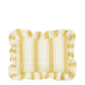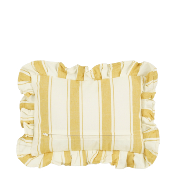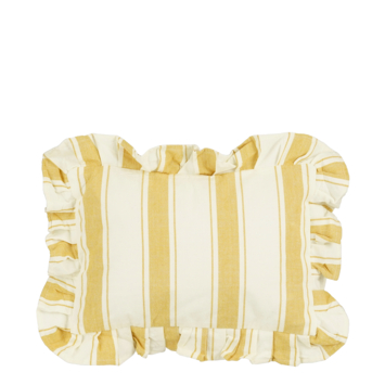 Geef je interieur een vrolijke uitstraling met dit sierkussen. Het kussen heeft een speels streeppatroon in de kleuren oker en wit, afgewerkt met ruches langs de rand. Gemaakt van katoen, voelt het heerlijk zacht aan. Lekker comfortabel! Dit sierkussen is perfect om je bank, bed of fauteuil extra sfeer te geven. Een gezellige toevoeging aan je woonkamer, kantoor of slaapkamer! De afmetingen zijn L35 x B20 x H10 cm.