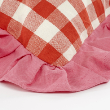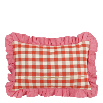 Geef je interieur een vrolijke uitstraling met dit sierkussen. Het kussen heeft een speels ruitpatroon in de kleuren rood en wit, afgewerkt met roze ruches langs de rand. Gemaakt van katoen, voelt het heerlijk zacht aan. Lekker comfortabel! Dit sierkussen is perfect om je bank, bed of fauteuil extra sfeer te geven. Een gezellige toevoeging aan je woonkamer, kantoor of slaapkamer! De afmetingen zijn L55 x B35 x H10 cm.