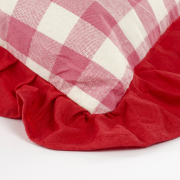 Geef je interieur een vrolijke uitstraling met dit sierkussen. Het kussen heeft een speels ruitpatroon in de kleuren roze en wit, afgewerkt met rode ruches langs de rand. Gemaakt van katoen, voelt het heerlijk zacht aan. Lekker comfortabel! Dit sierkussen is perfect om je bank, bed of fauteuil extra sfeer te geven. Een gezellige toevoeging aan je woonkamer, kantoor of slaapkamer! De afmetingen zijn L55 x B35 x H10 cm.