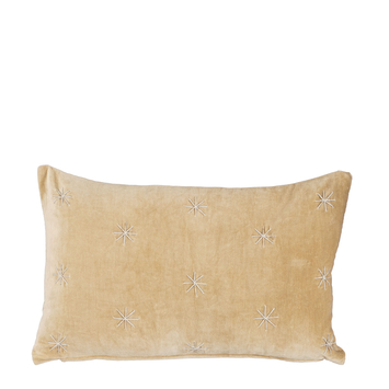 Met dit zachte kussen bevind je je in de zevende hemel. Het katoenen materiaal is fluweelzacht afgewerkt waardoor het niet alleen goed ademt maar ook erg prettig aanvoelt. Hij is voorzien van een heel subtiel sterrenontwerp waardoor hij past bij elk interieur. Dit kussen heeft daarnaast een pastelachtige lichtbruine kleur en is langwerpig met een lengte van 55 cm, een breedte van 35 cm en een hoogte van 10 cm.