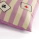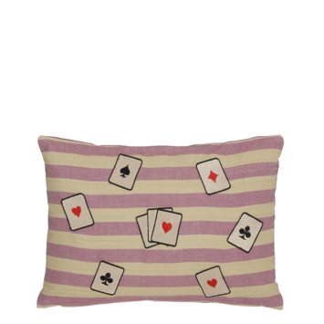 Dit sierkussen met geborduurde speelkaarten en lila strepen brengt kleur, karakter en een knipoog in je interieur. De speelse details geven het stevige katoenen kussen een opvallende twist, terwijl de zachte vulling zorgt voor comfort. Leuk als vrolijk accent in de tienerkamer, op de bank of in een gamehoek. Met zijn compacte formaat van 35 bij 25 centimeter voegt dit kussen net dat beetje extra toe – waar je het ook neerlegt.