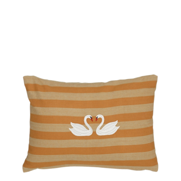 Twee zwanen en één hart: dit sierkussen voegt op een subtiele manier romantiek toe aan je interieur. De geborduurde witte zwanen op het beige-oranje gestreepte katoen zorgen voor een speels, maar verfijnd accent. Het langwerpige formaat is ideaal als rugsteun en staat mooi op bed, in een leeshoek of op de bank. De stevige katoenen stof voelt zacht aan en geeft het kussen een prettige structuur. Met een formaat van 35 bij 25 centimeter haal je een charmant detail in huis dat net even anders is.