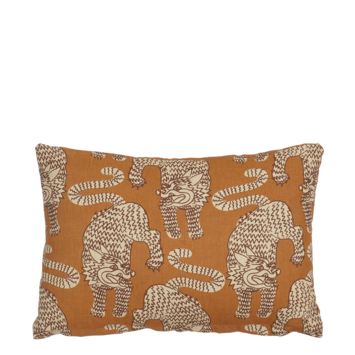 Geef je bank, fauteuil of bed een speels accent met dit lichtbruin kussen met tijgerdessin. Het kussen is gemaakt van katoen en heeft een patroon met tijgers in een lichte tint op een donkere ondergrond, waardoor het een opvallende uitstraling krijgt. Dankzij het compacte formaat is het ideaal om te combineren met grotere kussens of andere dessins. Met een afmeting van L35 x B25 x H10 cm voeg je eenvoudig extra sfeer toe aan je interieur.