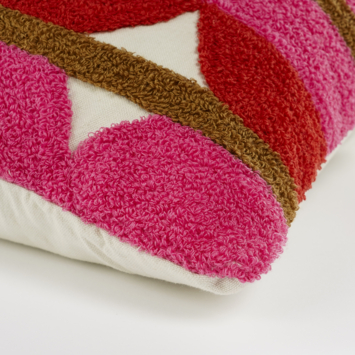 Breng kleur en gezelligheid in huis met dit opvallende sierkussen. Het kussen heeft een getuft patroon in vrolijke tinten roze, rood en bruin. Dit zorgt voor een speels en warm effect in je interieur. Het zachte katoen biedt extra comfort, waardoor het perfect is om op te relaxen. Met afmetingen van L55 x B35 x H10 cm is dit kussen een ideale keuze voor je bank, stoel of bed. Een eenvoudige manier om je interieur meer sfeer en stijl te geven!