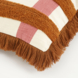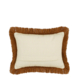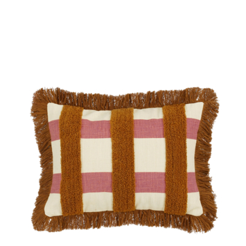 Geef je bank, fauteuil of bed een opvallend accent met dit bruine kussen met gestreept dessin en franjerand. Het kussen is gemaakt van katoen en heeft een decoratief patroon met brede strepen in bruin, roze en lichte tinten, afgewerkt met een franjerand rondom voor een speels detail. Met een formaat van L41 x B31 x H10 cm is het een compact, maar opvallend sierkussen dat je makkelijk combineert met andere kussens in neutrale kleuren of met bijpassende dessins. Perfect om extra sfeer toe te voegen aan je interieur.