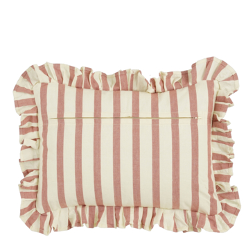 Geef je bank, fauteuil of bed een speels accent met dit kussen met golvend dessin in oudroze. Het kussen is gemaakt van katoen en heeft een patroon met strepen en golvende lijnen in verschillende tinten, afgewerkt met een rucherand rondom voor een decoratief detail. Dankzij het formaat van L55 x B35 x H10 cm is het ideaal als sierkussen en makkelijk te combineren met andere kussens in neutrale kleuren of met bijpassende dessins. Perfect om extra sfeer toe te voegen aan je interieur.