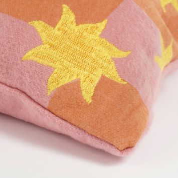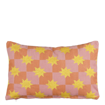 Breng het zonnetje in huis met dit geblokte sierkussen. Hij is gemaakt van katoen en daardoor heerlijk zacht om tegenaan te zitten. Op het kussen staan zonnetjes in de kleur geel en de basis van dit kussen is geblokt in de kleuren roze en oranje. Perfect om een ruimte op te vrolijken! Plaats hem op de bank, een fauteuil of op bed. Hij heeft een lengte van 55 cm, een breedte van 35 cm en een hoogte van 10 cm.