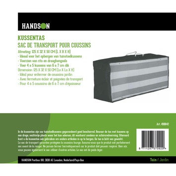 Deze Handson Kussentas 125x32x50cm is ideaal voor het opbergen van tuinstoelkussens. De tas heeft een draaghengsel en een rits en er passen zo'n 4 tot 5 kussens in, afhankelijk van het formaat kussen. De afmetingen van de hoes zijn: 125 x 32 x 50