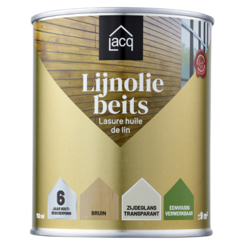 Lacq zuivere Lijnolie beits transparant bruin 750 ml is een authentiek lijnolie beschermingsmiddel, geschikt voor alle houten ondergronden met een zijdeglans afwerking. Het wordt op ambachtelijke wijze vervaardigd. De combinatie van houtolie en lijnolie zorgt voor een optimaal resultaat. Dankzij deze unieke samenstelling blijft de beitslaag lang flexibel, waardoor scheurvorming op het hout wordt voorkomen. Het voedt het hout van binnenuit en biedt tot wel 6 jaar bescherming!
