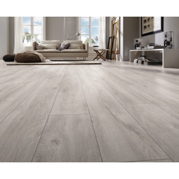Transformeer je ruimte met ons laminaat Extra Breed Grand Oak grijs eiken en creëer een sfeervolle en natuurlijke uitstraling. Met zijn tijdloze ontwerp vormt deze vloer een prachtige aanvulling op elk interieur. Met een voelbare houtstructuur en een subtiele v-groef langs alle zijden, heeft deze vloer een authentieke uitstraling die bijna niet van echt hout is te onderscheiden. De vloer beschikt over een klikverbinding, waardoor het leggen van het laminaat eenvoudig gaat en een naadloos effect heeft. Het laminaat kan daarbij zwevend worden gelegd, waardoor deze niet aan de ondervloer hoeft te worden gelijmd. De laminaatvloer is in combinatie met de juiste ondervloer prima geschikt voor eventuele vloerverwarming aan de hand van warmwaterbuizen. Dit kliklaminaat is antislip en biedt daardoor extra stabiliteit en grip om vallen te voorkomen. Het supersterke basismateriaal HDF (High Density Fiberboard) is PEFC gecertificeerd, wat betekent dat het hout afkomstig is uit duurzaam beheerde bossen. Laminaat is bovendien eenvoudig te reinigen en daarmee zeer onderhoudsvriendelijk. De laminaatvloer heeft een dikte van 8 mm, wat bijdraagt aan een goede stabiliteit en het product geschikt maakt voor zowel intensief woongebruik als normaal commercieel gebruik. Het product bevat 8 latten wat leidt tot een totale inhoud van 2.69 m².