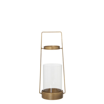 Niets is zo sfeervol als kaarslicht, zeker in deze lantaarn zorgt een klein flakkerend lichtje voor grootse sfeer. De lantaarn is gemaakt van goudkleurig metaal. De glazen cilinder zorgt dat wind en tocht geen invloed hebben op het vlammetje.
