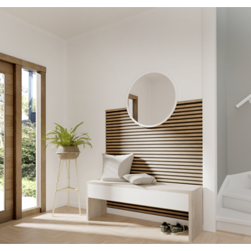 Met de CanDo green Decowall Acoustic creëer je snel en makkelijk een warme sfeer in huis. Door de achterzijde van vilt werkt de lattenwand bovendien geluidsabsorberend, waardoor de akoestiek in de ruimte verbetert. Het vilt gemaakt van recyclede PET-flessen. Het hout is PEFC gecertificeerd en daarmee afkomstig uit duurzaam beheerde bossen. De panelen zijn kamerhoog (260 cm) en door het lichte gewicht makkelijk te vervoeren en hanteren. Ook het monteren is heel eenvoudig: de lattenwand kan op de muur gelijmd of geschroefd worden. Eén paneel is goed voor 30cm wand. Verpakt per 2 panelen. De MDF ommantelde lattenwanden zijn verkrijgbaar in verschillende decoren. Ook zijn eindprofielen beschikbaar om het product mooi af te werken. De eindprofielen zijn, net al de wandpanelen zelf, zowel horizontaal als verticaal te gebruiken.