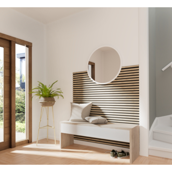 Met de CanDo green Decowall Acoustic lattenwand licht eiken 260x30 cm creëer je een sfeervolle en geluiddempende wandoplossing in je interieur. De panelen zijn voorzien van een vilten achterzijde, die zorgt voor geluidsabsorptie en een verbeterde akoestiek. Elk pakket bevat twee panelen van in totaal 1,56 m², waardoor je eenvoudig een kamerhoge wand kunt realiseren. De lattenwand is gemaakt van PEFC-gecertificeerd hout (uit verantwoord beheerde bossen)en vilt van gerecyclede PET-flessen. De wandpanelen zijn eenvoudig te monteren met een montagekit of schroeven en kunnen zowel horizontaal als verticaal worden aangebracht. Dankzij het lichte gewicht zijn de panelen gemakkelijk zelf te vervoeren en te bevestigen. Let op: de Decowall Acoustic is niet geschikt voor gebruik in natte ruimtes. Om de afwerking compleet te maken, zijn er bijpassende eindprofielen beschikbaar in dezelfde stijl als de panelen.