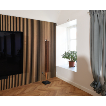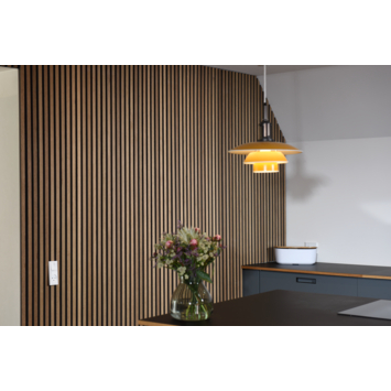 Met de lattenwand creeër je eenvoudig een scandinavisch stijlvol design in jouw huis. Met behulp van de kant en klare panelen kun je in een korte tijd een wand dichtzetten in woonkamer, keuken of slaapkamer en krijg je een warme uitstraling. Het paneel is 300 cm lang en 60,5 cm breed. De vilten achterwand, die gemaakt is van duurzame materialen zoals PET flessen, is zodanig afgewerkt dat er direct met een nieuw paneel verder gewerkt kan worden en de juiste afstand tussen de latten behouden blijft. Op het vilt zitten zwart gekleurde MDF latten die zijn voorzien van echt hout fineer. Iedere afzonderlijke lat is dus uniek. De lattenwand is in meerdere decoren beschikbaar. Het is belangrijk om bij het monteren van de panelen 2mm afstand te houden tussen de verschillende panelen. De vilten onderrug kan namelijk vanwege temperatuurverschillen lichtelijk uitzetten.