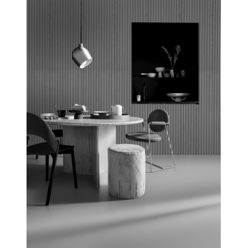 Op het vilt zit een minimale laag zwart gekleurde MDF latten die voorzien zijn van echt hout fineer. Iedere afzonderlijke lat is dus uniek. De lattenwand is in twee decors beschikbaar.
