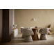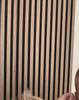 Op het vilt zit een minimale laag zwart gekleurde MDF latten die voorzien zijn van echt hout fineer. Iedere afzonderlijke lat is dus uniek. De lattenwand is in twee decors beschikbaar.