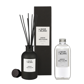 Met de Le Noir & Blanc geurstokjes haal je de sfeer en geur van luxe hotels in verre oorden naar je eigen huis. Het ingetogen en elegante design met matzwart glas past in elk interieur! De geur Jardin des Fleurs vindt zijn oorsprong in het Franse Grasse, de belangrijkste stad in de parfumindustrie. De combinatie van rozen, lelietjes-van-dalen, grapefruit en limoen zorgt voor een frisse, romantische geur die doet denken aan de sprankeling van een lente wandeling. Bepaal zelf de intensiteit en geniet! De geurstokjes hebben een afmeting van H14,5 x Ø6,5 cm.