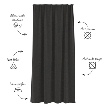 Je kunt dit gordijn met de hand wassen in lauw water en evt. lauw strijken, maar het gordijn is niet geschikt voor de centrifuge en droger.